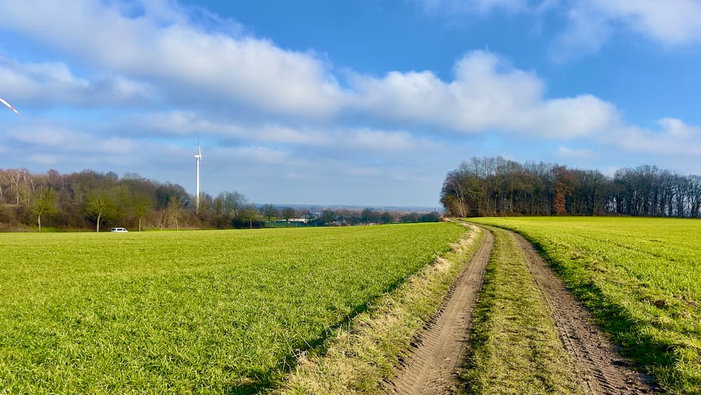 Die Felder von Hinsbeck und Hübeck | Einfache und hundefreundliche Wanderung durch die hügelige Landschaft von Hinsbeck über Hübeck, die alte Bahntrasse Kempen–Venlo und vorbei an Haus Milbeck zum Königshof.